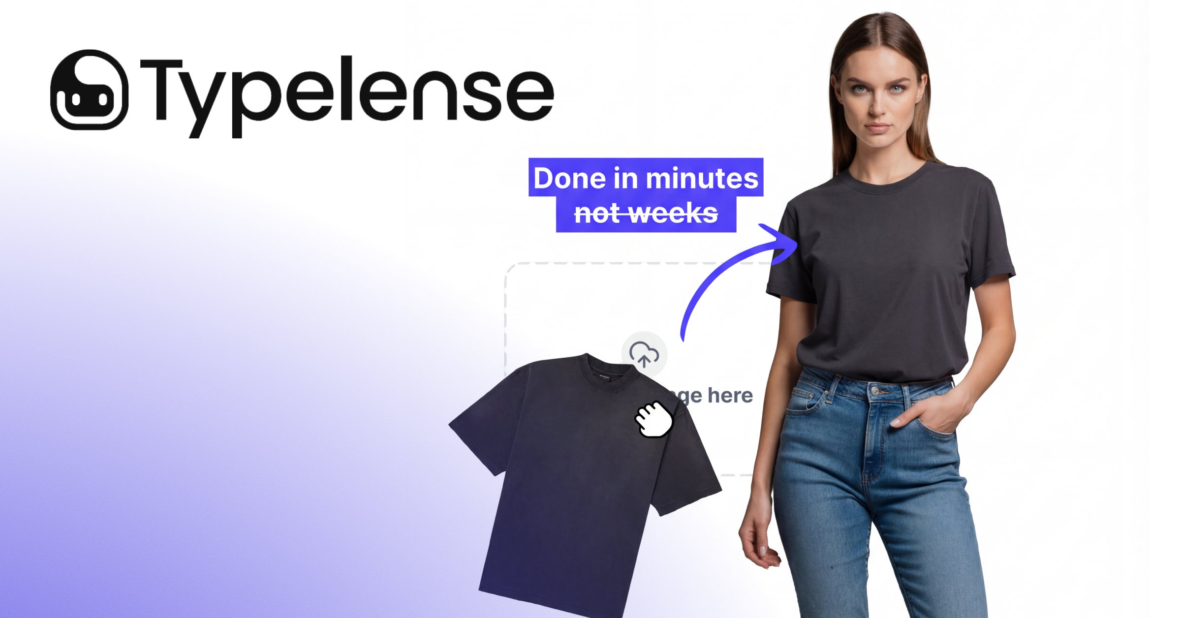 Typelense Plattform: AI fashion models erstellen aus einem T-Shirt-Produktbild ein fotorealistisches Model-Foto in wenigen Minuten.