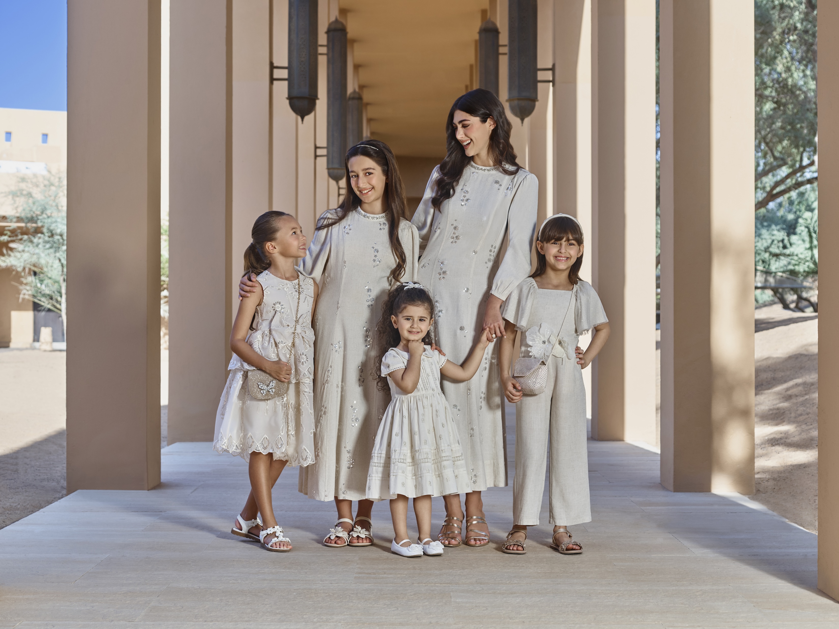 تركز إطلالات أمسيات رمضان على طابعٍ من الأناقة الخالدة التي يشترك فيها جميع أفراد العائلة، من خلال طيف من الألوان المحايدة الدافئة التي تتخللها درجات الأبيض الناعمة واللمسات المعدنية الرقيقة. تمتد تصاميم المجموعة لتشمل جميع أفراد العائلة، من الوالدين إلى الأطفال وكذلك الرضَّع؛ إذ تقدم للجميع تصاميم متناغمة تجمع بين الانسجام العام والتميز الفردي. تشكل الأقمشة المصنوعة من مزيج الكتان أساس هذه المجموعة؛ فهي توفر راحة وخفة مع إحساس راقٍ، فيما تضيف الزخارف الرقيقة واللمسات اللامعة الهادئة طابعاً احتفالياً يناسب التجمعات النهارية والمناسبات المسائية على حد سواء. والنتيجة: إطلالة عائلية تجمع بين الراحة والرقي، وتعكس بروحها جوهر احتفالات شهر رمضان المبارك.