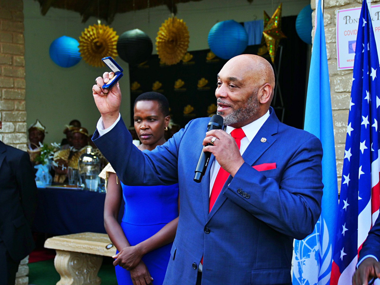 His Royal Highness King Tikoe Tefo Meshack Lekitlane receives the iChange Nations™ Global Voice of Change Award from Dr. Ruben West, ICN Special Envoy - photo provided by Godfrey Atsing'a